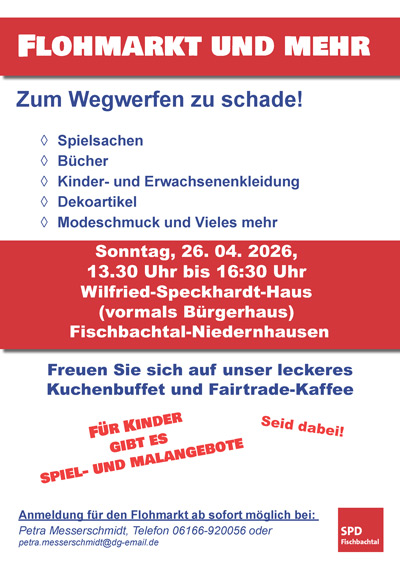 Am Sonntag, 26.04.2026, findet der Frühlingsflohmarkt der SPD Fischbachtal statt - und zwar zum 66. Mal