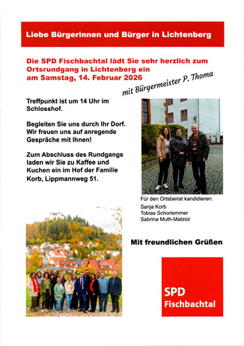 Die SPD Fischbachtal und Bürgermeister Philipp Thoma laden sehr herzlich interessierte Bürgerinnen und Bürger zum Ortsrundgang durch Lichtenberg ein. Begleiten Sie uns durch Ihr Dorf. Wir freuen uns auf anregende Gespräche mit Ihnen.